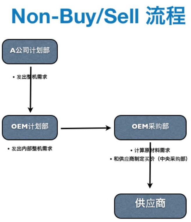 在Non-Buy&Sell的模式下,首先由品牌客戶的計劃部門發(fā)出整機的需求計劃給OEM的計劃部,OEM的計劃部在收到需求后將它轉給采購部的各個采購,OEM的采購部人員會根據原材料的用量來計算原材料的需求數量和使用時間。再由采購下訂單給供應商之前,OEM的中央采購部會直接和供應商協商采購價格和采購合同。在拿到采購價格和采購合同后,各個采購人員會下訂單給供應商,并提供訂單的數量和需求時間。供應商在接到OEM的訂單后進行內部生產后再將原材料送到OEM的工廠。